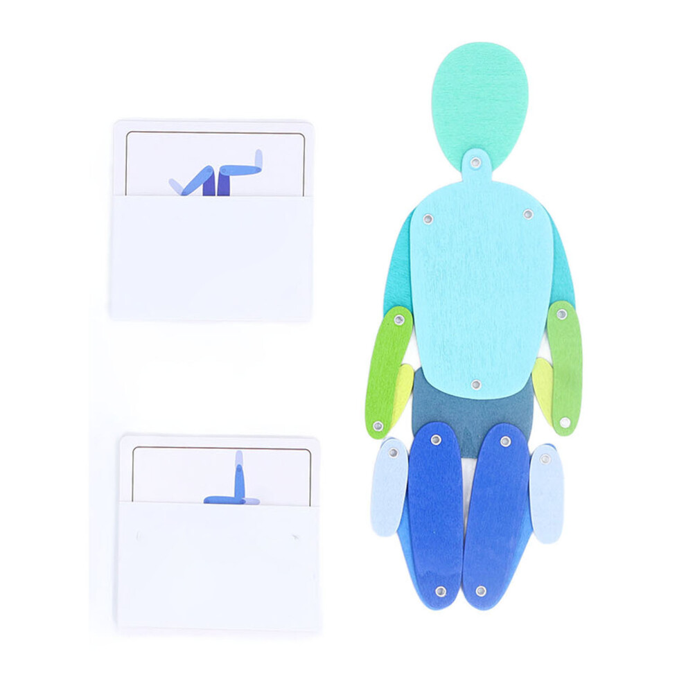 Blue Wooden Stickman Toy With Moving Limbs 30 Cards Educational Exercising H BL