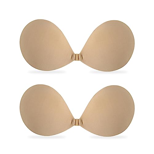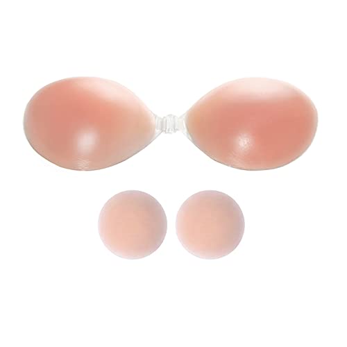 Bafully Invisible Adhesive Strapless Bra Sticky Push Up Silicone Bra with Nipple Covers for Women Backless Dress (L, Beige with 2 Nipple Covers)
