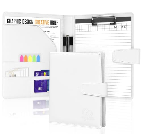Agoer DIN A5 Portfolio Folder,Clipboard Folder Faux Leather Conference Folder with Legal Pad,A5 Clip Board with Magnetic Cover Storage with Sticky Arrow Tabs & Pen for Work Business Document,White