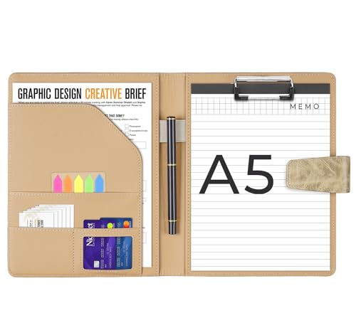 Agoer A5 Clipboard Portfolio Folder,DIN A5 Faux Leather Conference Folder Writing Clip Board with A5 Paper,Magnetic Closure Document Organizer with Sticky Tabs,Pen for Business Meetings,Yellow Ginger