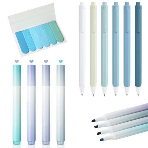 OFFCUP Pastel Highlighters, 13PCS Aesthetic School Supplies, 6pcs No-Bleed Highlighters, 6pcs Retractable Rollerball Pens Ink Gel Pens, 1PC Sticky Tabs, Cute Stationary for School Office Home (Blue)