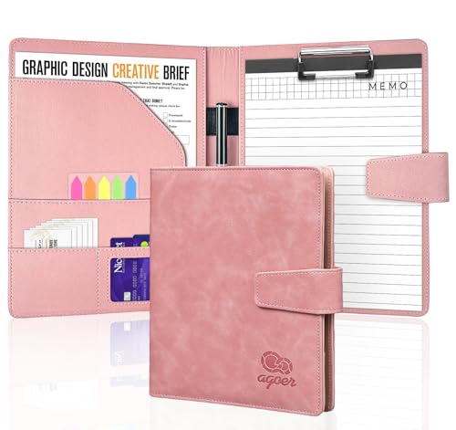 Agoer Clipboard Folder DIN A5,Faux Leather Clipboard with Magnetic Cover Legal Pad Conference Presenter Portfolio Folder A5 Clip Board Resume with Storage Sticky Tabs,Pen for Business Office,Pink