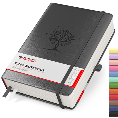 Smarpau Thick B5 Lined Notebook - 320 Pages Hardback Leather Journal, 100gsm No Bleed Paper, Inner Pocket, Sticky Tabs, Lined Journals Notebooks for Women Men Writing Work Writing, 19 x 25 cm - Black
