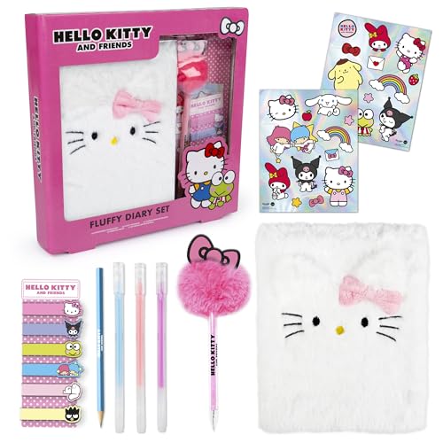 abeec Hello Kitty Fluffy Diary Set For Girls – Notebook With Pom Pom Pen, Holographic Stickers, Gel Pens & Sticky Tabs – Kawaii Stationery Gift Set
