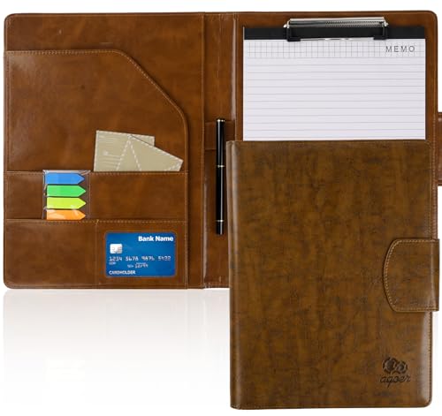 Agoer A4 Clipboard Folder,Faux Leather Conference Portfolio with Magnetic Closure Cover,Leather A4 Folder with Paper,Sticky Arrow Tabs,Pen,A4 Clip Board with Storage for Men & Women,Retro Brown