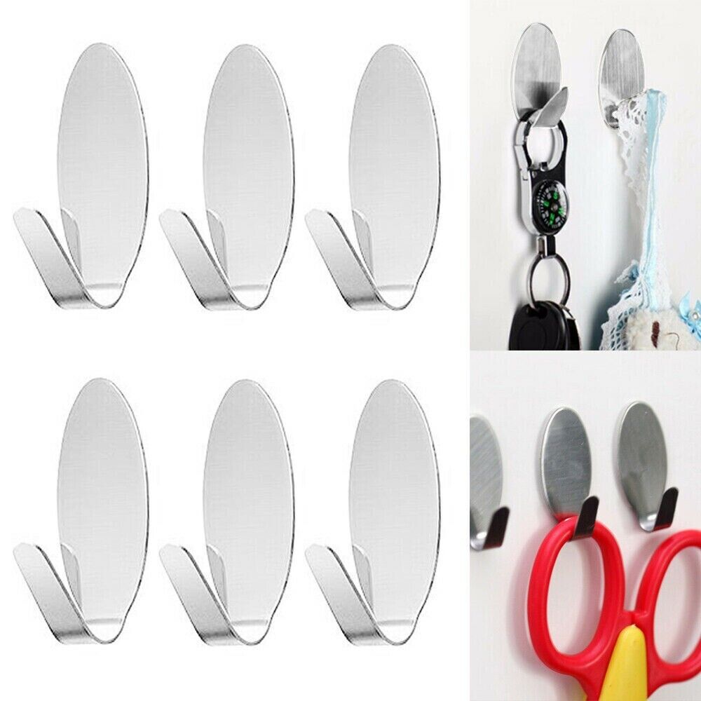 Self Adhesive Hook Hangers Pack of 6 Stainless Steel Oval Sticky Hooks Wall Door