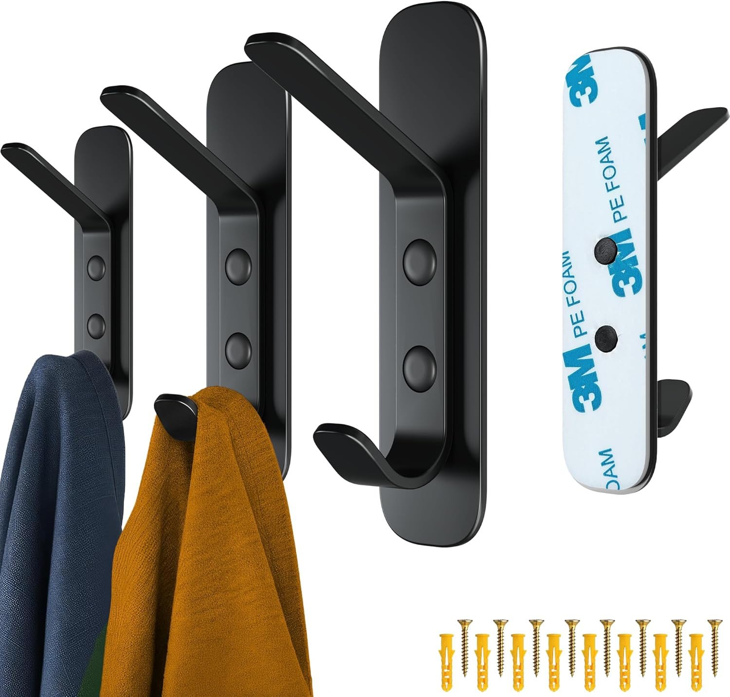 4smile Coat Hooks 4pc Black Stainless Steel - Self Adhesive Hooks Sticky Hooks Wall Hooks Bathroom Hooks- Versatile for Heavy Duty Coat Hanging on Walls & Doors with Dual Adhesive or Nail Option