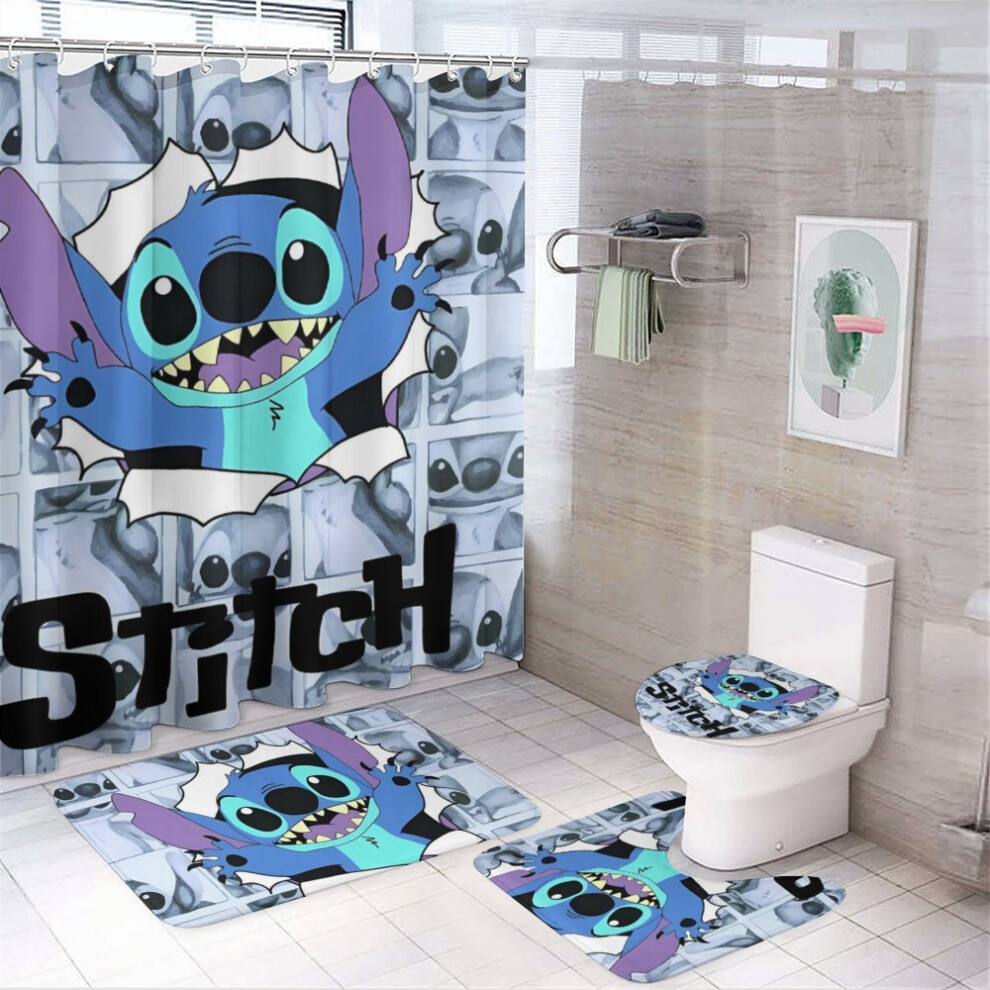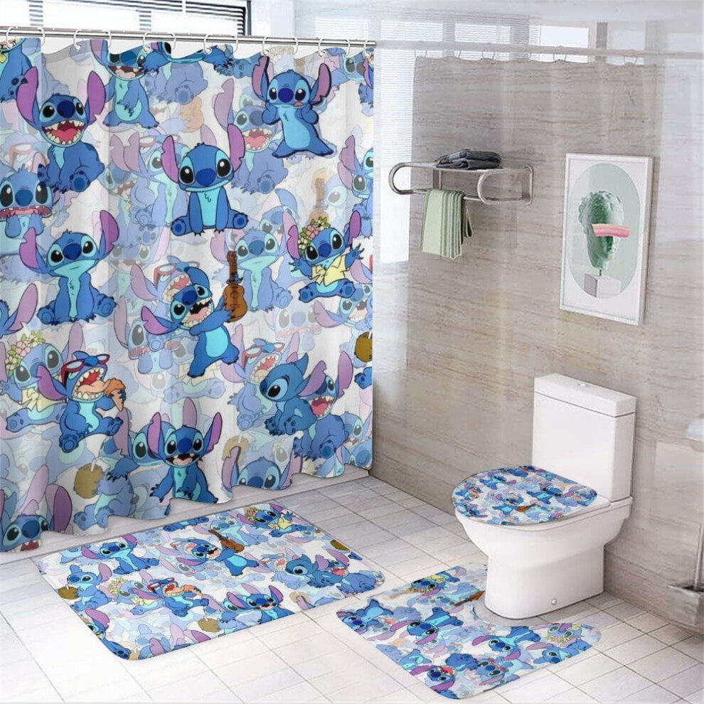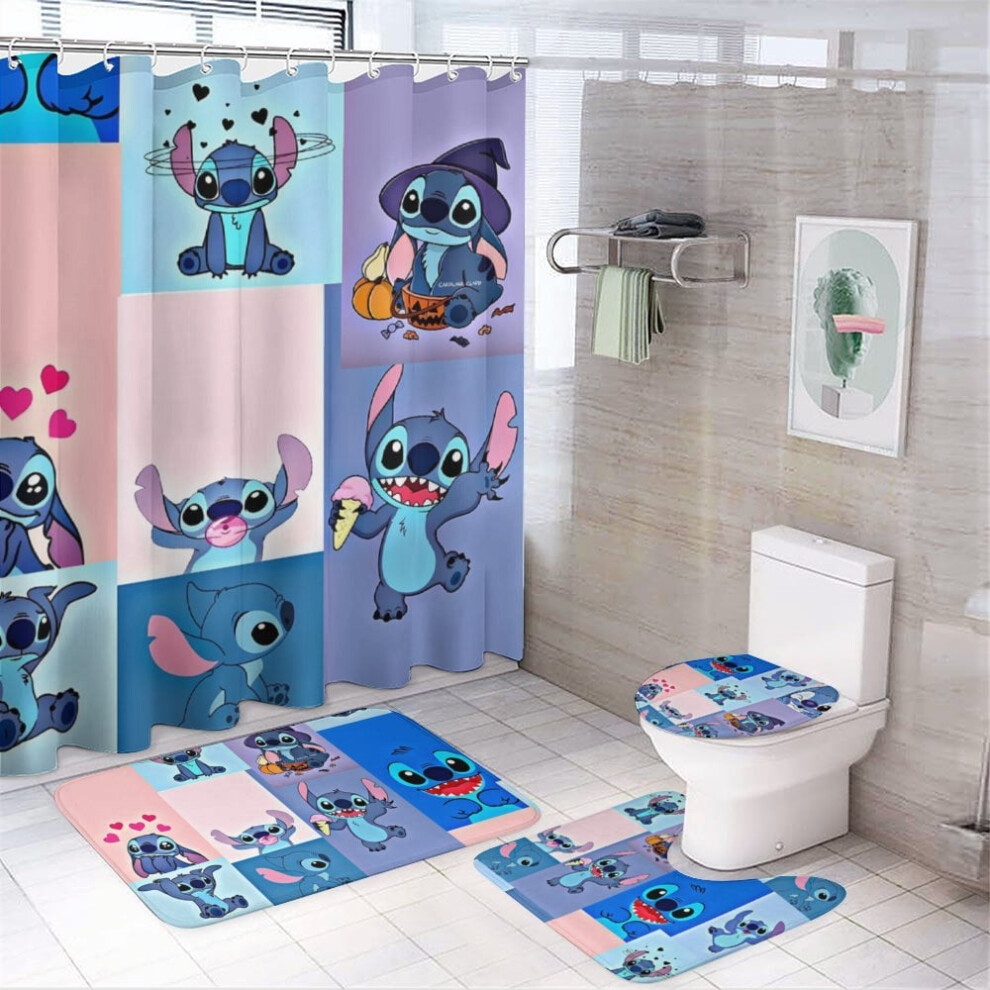 Stitch 4Pcs Family Shower Curtain Set with Non-Slip Rugs, Toilet Cover & Bath Mat, Black Waterproof Curtains + 12 Hooks, 72x72 Inch