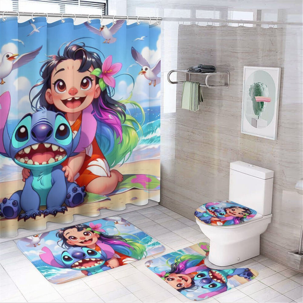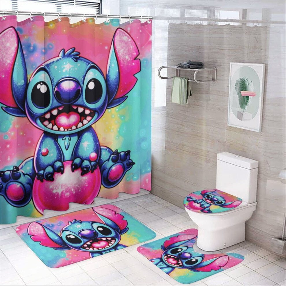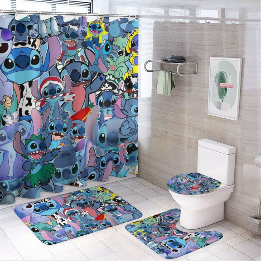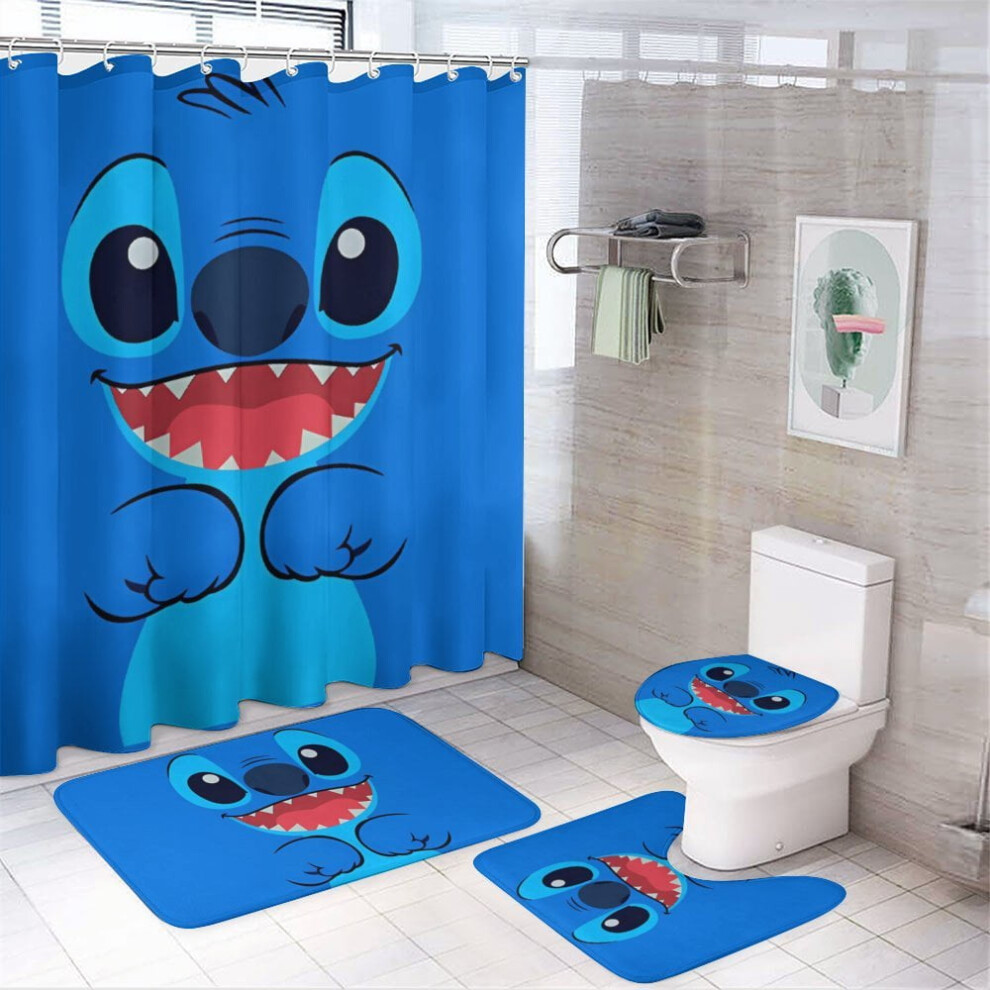 Stitch 4Pcs Family Shower Curtain Set with Non-Slip Rugs, Toilet Cover & Bath Mat, Black Waterproof Curtains + 12 Hooks, 72x72 Inch