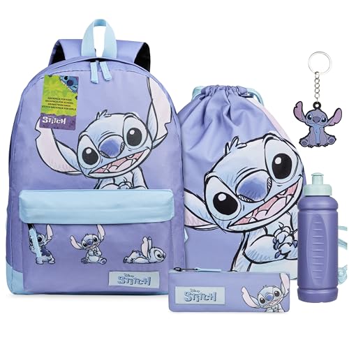 Disney Stitch School Bag Set, 5 Pieces with Backpack, Drawstring Bag, Pencil Case, Water Bottle & Keyring - Stitch Gifts