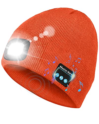 Victoper Gifts for Men, Bluetooth Beanie Hat with Light Upgraded V5.0 Bluetooth Hat with Torch Built in for Winter Running Wireless Music Beanie USB Rechargeable Gifts Stocking Fillers for Men Orange