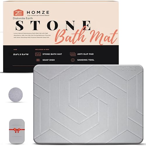 HOMZE Stone Bath Mat Large, Natural Super Absorbing Diatomaceous Earth Bath Mat, Luxury Bathroom Mat Quick Dry, Innovative Stone Drying Mat for Kitchen Counter, Light Grey (23.6 x 15.4)