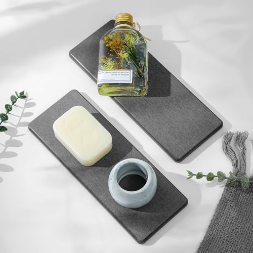 Razborci 2PCS Bathroom Trays, Water Absorbing Diatomite Stone Quick Drying Mat for Kitchen Counter, Dish Rack Soap Dispenser Sponge Holder Caddy Sink Vanity Organizer, Dark Gray Slate,9"x3.5"