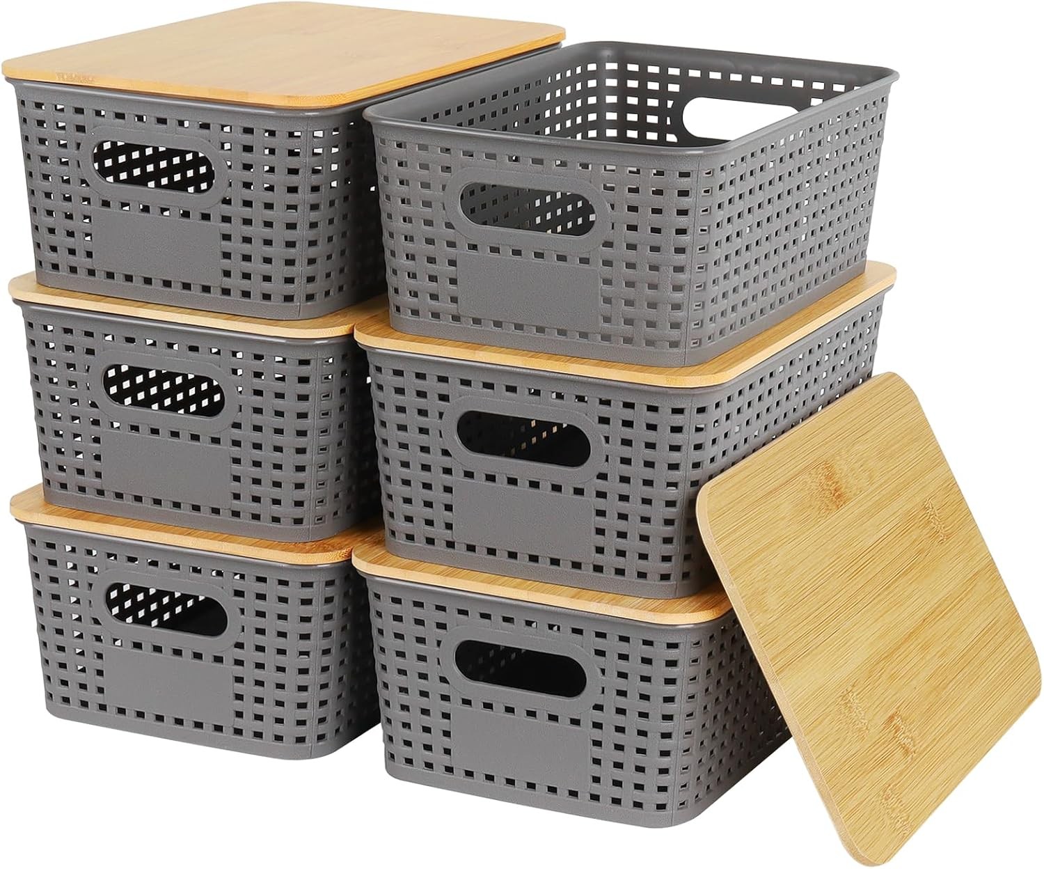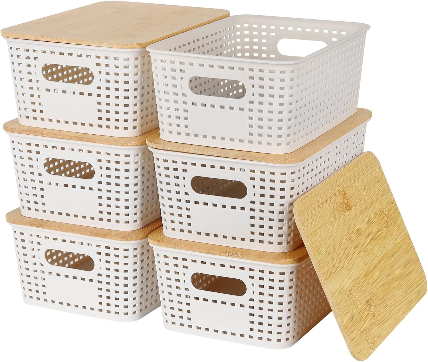 6Pcs Storage Box with Lid, Plastic Stackable Storage Baskets with Bamboo Lids,