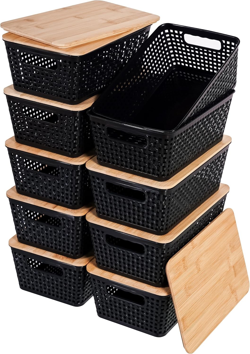 Citylife Set of 10 Pack Storage Baskets with Bamboo Lids,Woven Plastic Storage