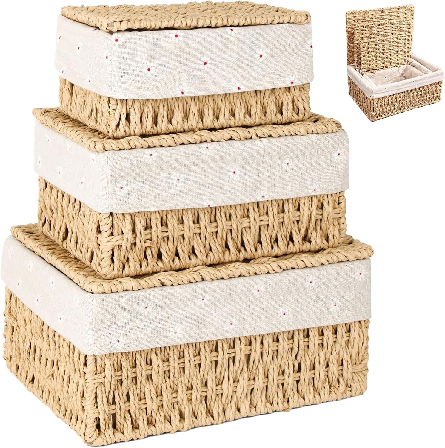 3pcs Woven Storage Baskets with Lids, Decorative Storage Boxes, Space-Saving Wi