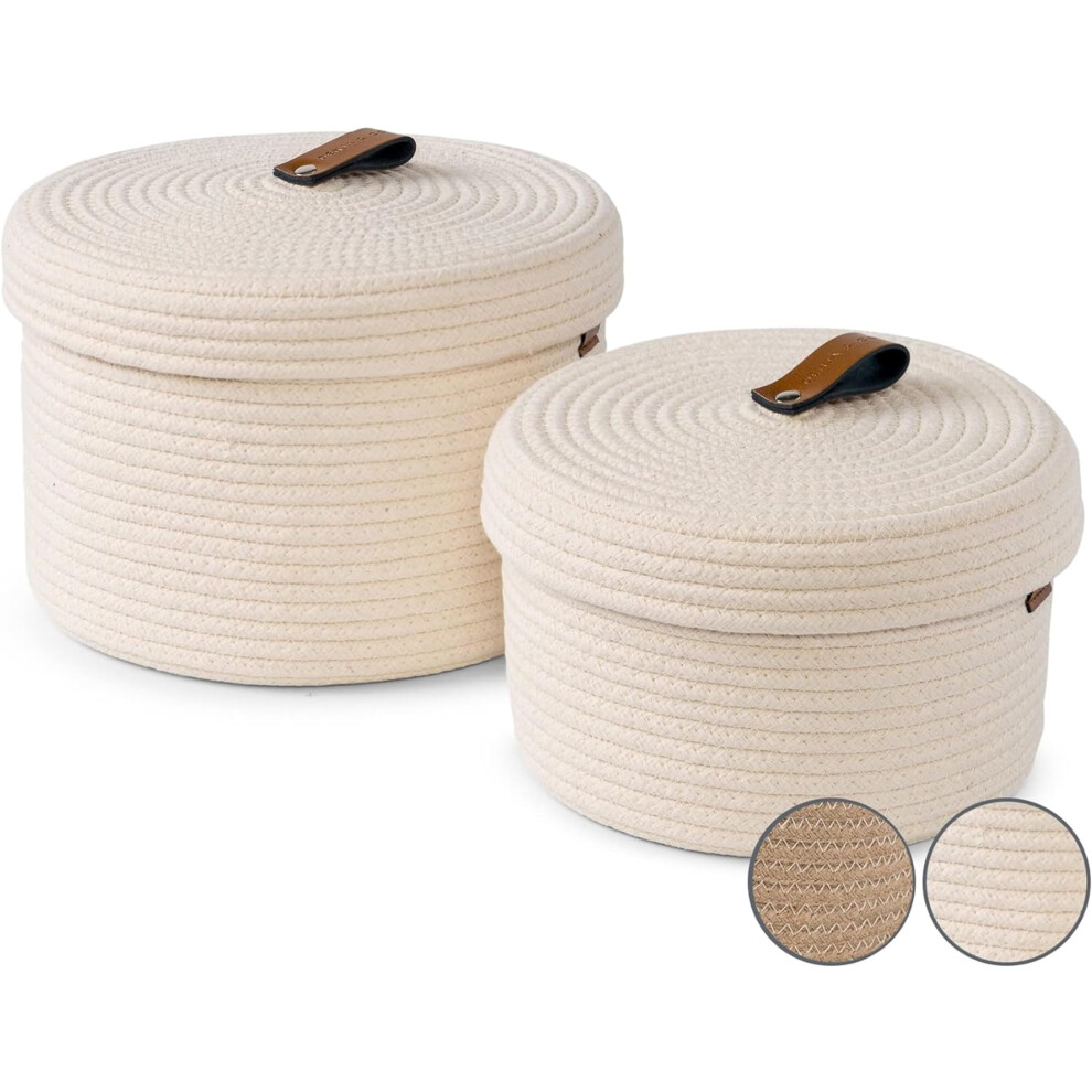 DENJA & CO Set of 2 Decorative Storage Baskets with Lids - Round Woven Baskets for Home Decor and Organizing - Small Shelf Baskets with Leather Tabs a