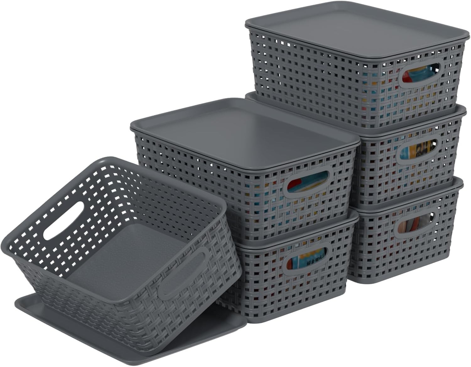 6 Pack Plastic Weave Storage Baskets with Lids, Small Stackable Lidded Storage