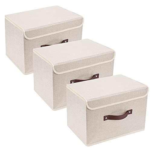 TYEERS Collapsible Storage Box with Lid, Fabric Storage Box for Clothes, Wardrobe Storage, 38x25x25 cm, Set of 3, Beige