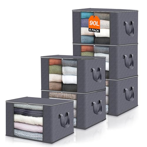 Clothes Storage Bags, 6 Pack 90L Large Capacity Storage Boxes With Lid, Zips & Reinforced Handle for Moving House - Thick Fabric Foldable Large Storage Box for Clothes Comforters Blankets Bedding