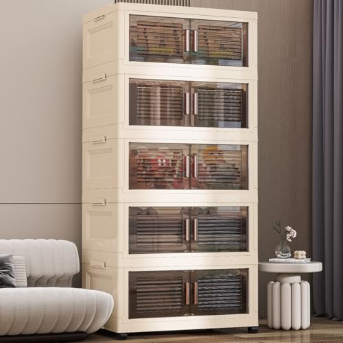 KHNR Storage Bins with Lid, 85L Collapsible Storage Box with Doors and Wheels, Closet Organizer and Storaging,5 Pack Stackable Storage Bins Open Front,Plastic Storage Box for Closet Clothes