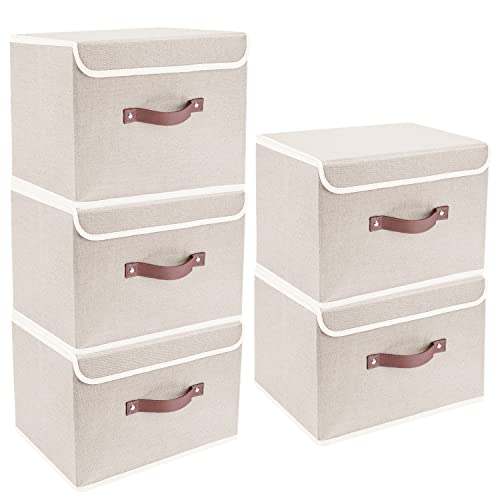 TYEERS Collapsible Storage Box with Lid, Fabric Storage Box for Clothes, Wardrobe Storage, 38x25x25 cm, Set of 5, Beige