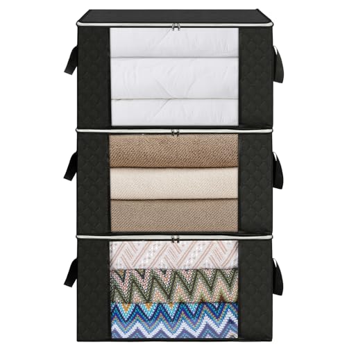 AiQInu 3PCS 90L Foldable Storage Box for Clothes and Blankets with Reinforced Handle for Bed Linen 60 x 44 x 35 cm Black