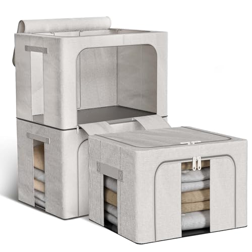 Boic 66L Clothes Storage Boxes With Metal Frame, 3 Pack Foldable Clothes Storage Organiser Storage Boxes With Lids Foldable Storage Box For Clothes, Bedding, Blankets, Grey
