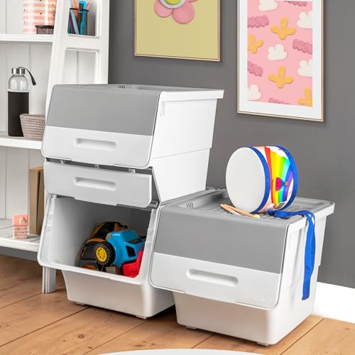 3FlexHome Stackable Toy Storage Box on Wheels with Front Lid – Plastic Storage Containers for Toys, Snacks, Clothes, Multi-Purpose Tower Organiser for Kitchen, Bathroom, Bedroom (White-Grey, 3x33LT)