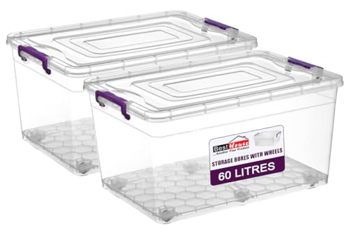 BH | 60L - 2 PCS Clear Large Plastic Storage Box with Lids on Wheels | Containers Multi Purpose use for Home, office, Kitchen, Toys, Clip Locked (60 Litres) - By BEST HOUSE
