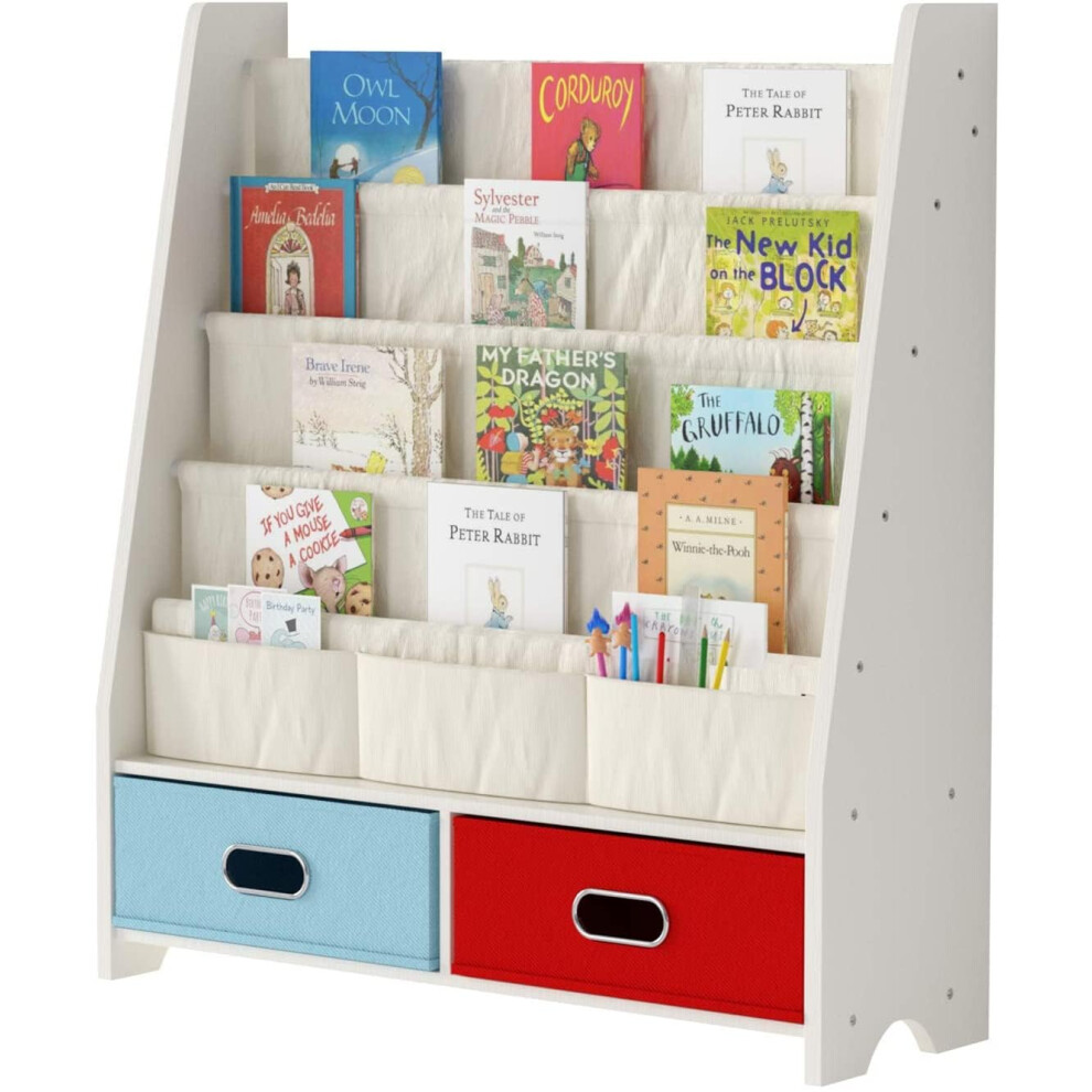 SEIRIONE Kids Book Shelf, Children Display Rack, 4 Sling and 2 Storage Boxes for Toys Organizer, White