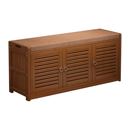 Bamboo Storage Benches,Hallway Shoe Storage Bench for Entryway,With Cushions,2 Levels of Storage Space,With Cabinet Doors,Dustproof,Suitable for Balcony,Entrance,Bedroom,(Grid,100x33cm/39.3x13in)