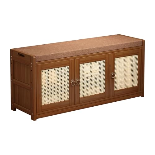 Bamboo Storage Benches,Hallway Shoe Storage Bench for Entryway,With Cushions,2 Levels of Storage Space,With Cabinet Doors,Dustproof,Suitable for Balcony,Entrance,Bedroom,(Rattan,100x33cm/39.3x13in)