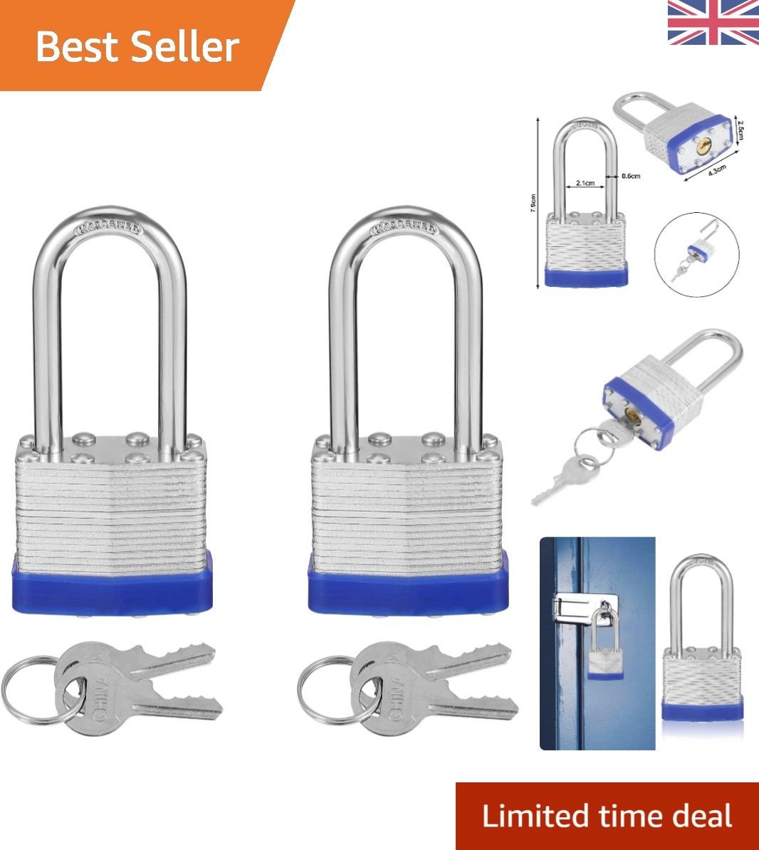 2 Durable Weather-Proof Padlocks with Long Shackles - Ideal for Storage & Sheds