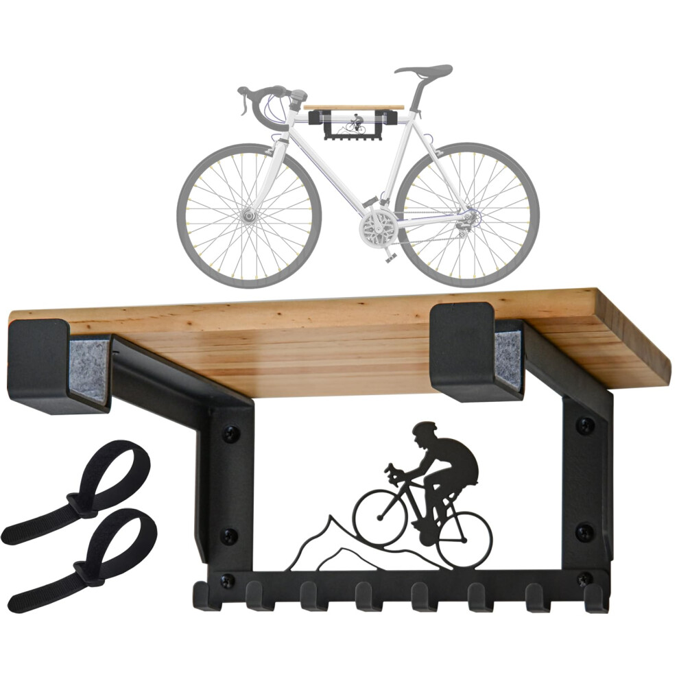 bike Rack Wall Mount with Shelf and 8 Hooks Offers Horizontal Indoor Storage for Sheds and Garages. Wooden Bike Bracket for Road and Mountain