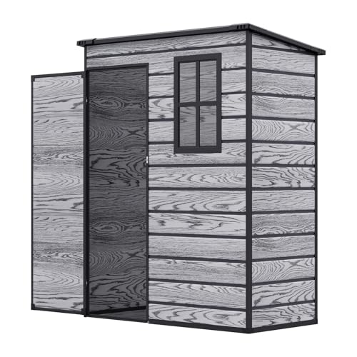 XEMQENER Plastic Garden Storage Shed with Floor, 4.6x2.6 FT Lockable Outdoor Storage Shed with Window, Waterproof Garden Sheds for Gardening Tools & Equipment, 140x81x193cm, Wood Grain Dark Grey