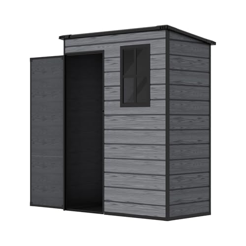 XEMQENER Plastic Garden Storage Shed with Floor, 5x3 FT Lockable Outdoor Storage Shed with Window, Waterproof Garden Sheds for Gardening Tools & Equipment, 151x92x192cm, Wood Grain Dark Grey