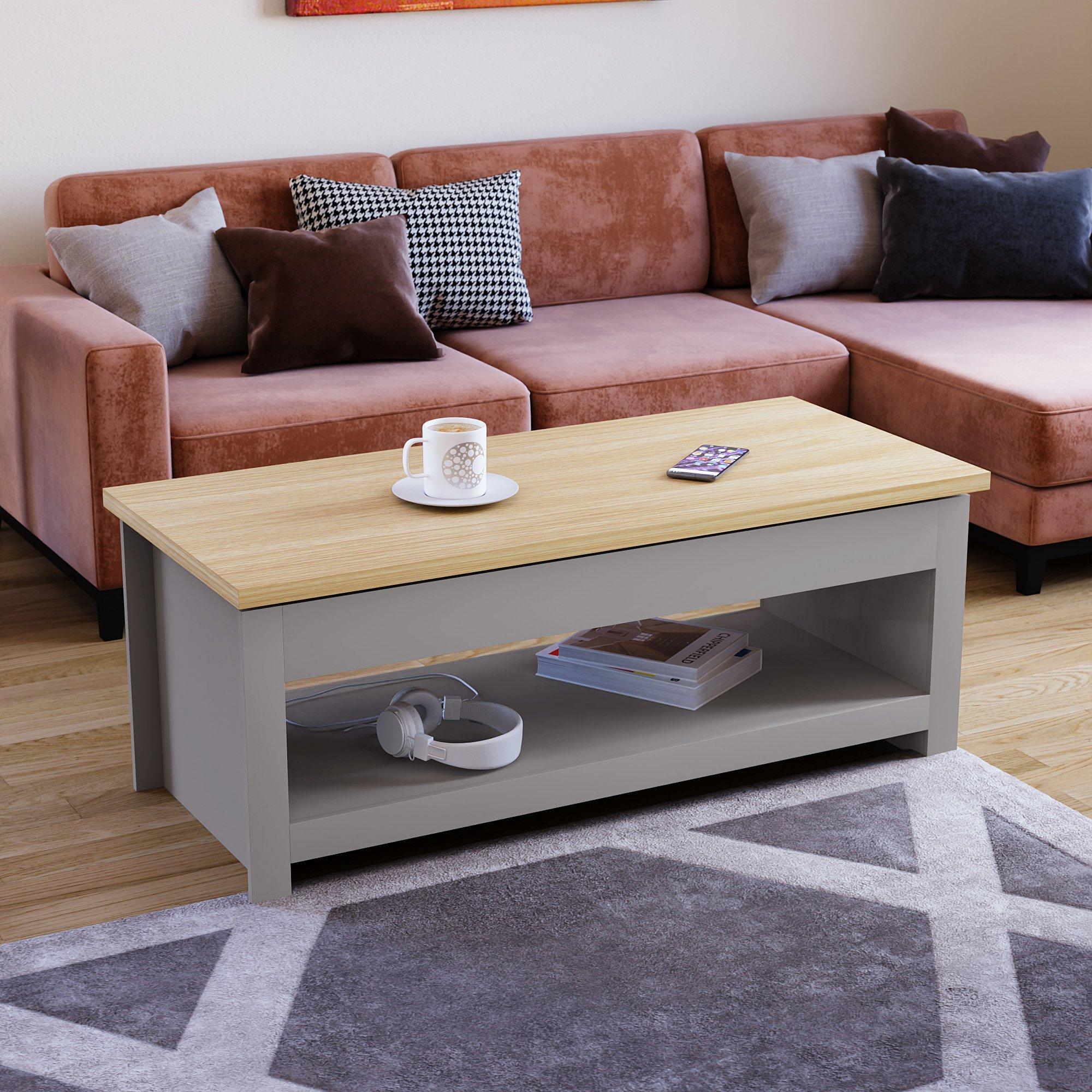 GFW Lift Up Coffee Table With Hidden Storage For Living Room. Modern Wooden Lift Top Coffee Tables With Display Shelf & Storage Compartment For Media & Accessories, Oak, H39.5cm x W105cm x D50cm