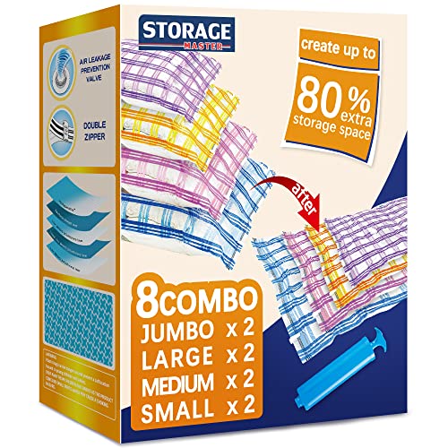 STORAGE MASTER Vacuum Storage Bags, 8-pack Jumbo Size Space Saver Bags 80% More Storage Space with Hand Pump (Jumbo 8 Pack)