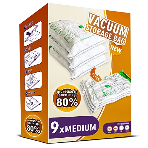 Storage Master Space Saver Bags for Travel and Home Reusable Vacuum Storage Bags Save 80% More Storage Space Work with Vacuum Cleaner (9 Medium, No Pump Included)