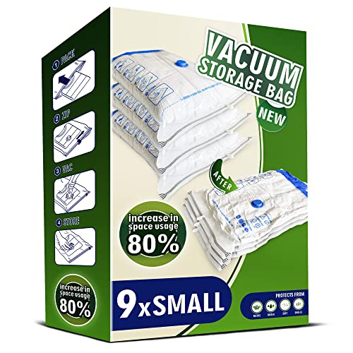 Storage Master Space Saver Bags for Travel and Home Reusable Vacuum Storage Bags Save 80% More Storage Space Work with Vacuum Cleaner (9 Small, No Pump Included)