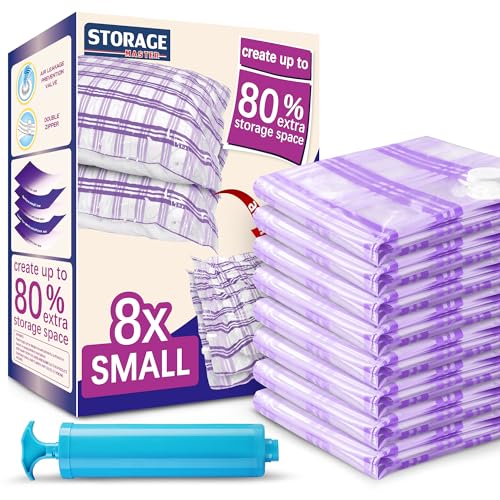 Storage Master Space Saver Bags for Travel and Home Reusable Vacuum Storage Bags Save 80% More Storage Space Work with Vacuum Cleaner + Travel Hand Pump (8 Small)