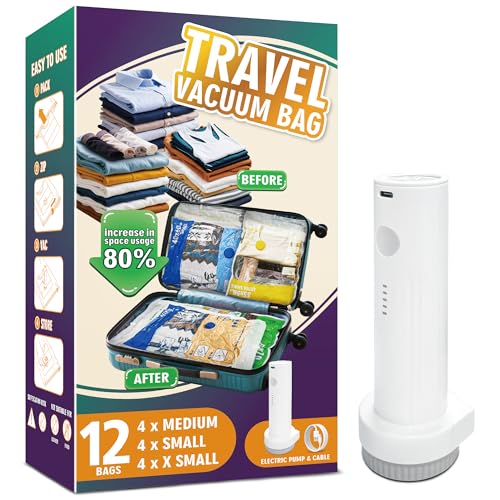 Storage Master Space Saver Bags for Travel and Home Reusable Vacuum Storage Bags Save 80% More Storage Space, 12 Pack, with Electric Pump