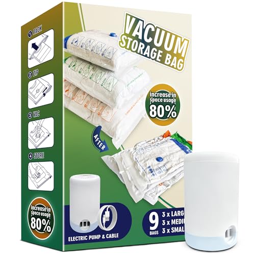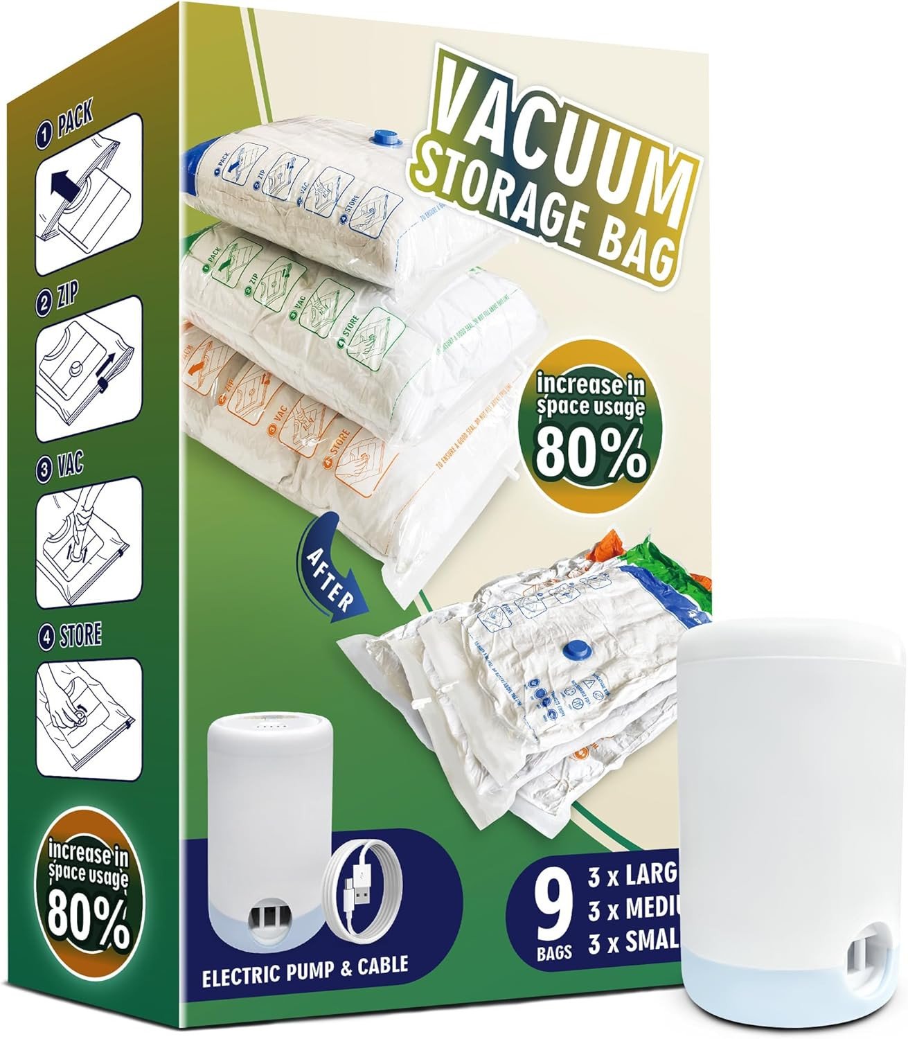 STORAGE MASTER Space Saver Bags for Travel and Home Reusable, 9 Pack Vacuum Storage Bags Save 80% More Storage Space, with Electric Air Pump