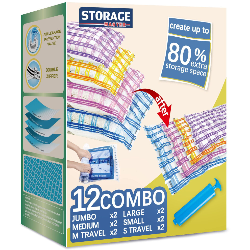 Storage Master Space Saver Bags for Travel and Home Reusable Vacuum Storage Bags Save 80 More Storage Space with Travel Hand Pump 12 Pack â This