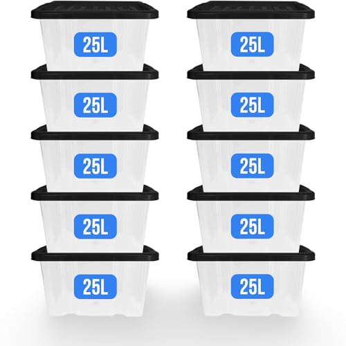 KAPCO Storage Solution – 10 x 25L Medium Plastic Storage Boxes with Lids, Transparent Stackable Container with Snap-On Black Lid | Ideal for Clothes, Craft, Kitchen Storage, BPA-Free Tubs | 25 Litre