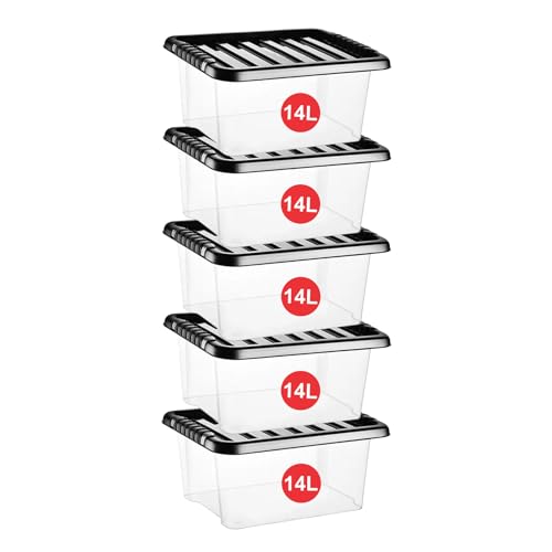 RelianceUK 14L Plastic Storage Boxes with Lids (14 Litre / 5 Pack) | Stackable Boxes with Black Lid and Clear Containers for Home Kitchen | Storage Tubs for Office Accessories