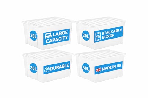 RelianceUK 4 X 30L Plastic Storage Boxes With Lids | Clear Plastic Container With Lids for Clothes Shelves Shoes Crafts | (30 Litre / 4 Pack) Stackable Multipurpose Tubs for Home Office Kitchen