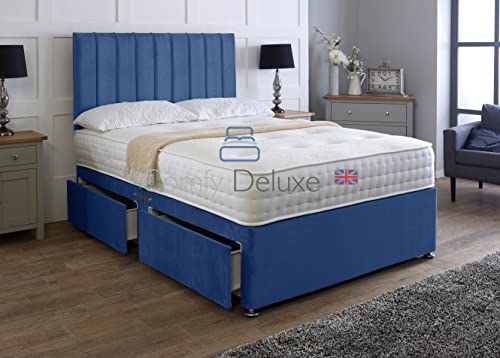 Comfy Deluxe LTD 4FT6 Double Bed Set with Memory Sprung Mattress - Parliament Blue Plush Velvetto Divan Bed Frame with 26" Apollo Headboard, Chrome Glider Feet & No Storage - UK Made