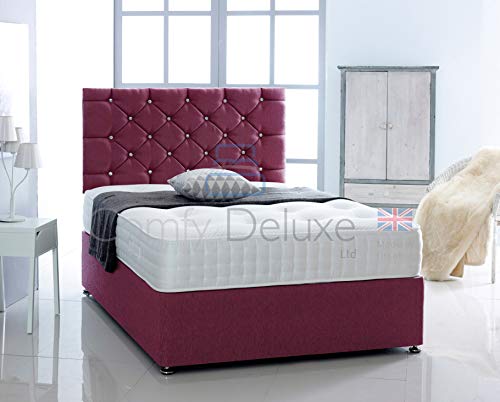 Comfy Deluxe LTD 4FT Small Double Bed Set with Memory Spring Mattress - Plum Chenille Divan Bed Frame with stylish 26" Chesterfield Headboard, Chrome Glider Feet & No Storage - UK Made